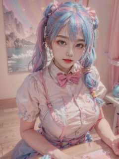 , 1girl, twintails, multicolored hair, hair over one eye, x hair ornament, hair ornament, blue eyes, blue hair, smile, bow, pink hair, blonde hair, solo, looking at viewer, yellow bow, indoors, heart, makeup, skirt, selfie, phone, dress, teeth, hairclip, monitor, reaching towards viewer, long hair, bangs, short sleeves, pink nails, bowtie, suspenders, yellow bowtie, hair tie, open mouth, computer, stuffed toy, sitting, shirt, livestream, belt, quad tails, pill, v,sparkle,violet lighting,,the most beautiful form of chaos, elegant, a brutalist designed, vivid colours, romanticism, atmospheric, (RAW photo, best quality), (realistic, photo-realistic:1.3), masterpiece, an extremely delicate and beautiful, extremely detailed,, (floating colorful {wind|water magic|ink|crystals|fire|ice|flame|lightning|web|rocks|sand|particles|sparkles|blood}:1),