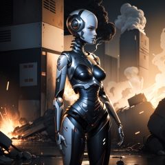 masterpiece,best quality,humanoid robot,1girl,joints,solo,robot joints,android,science fiction,breasts,shiny,robot,cyberpunk,mechanical parts,bald,medium breasts,realistic,colored skin,standing,no humans,black background,looking to the side,shiny skin,(☢:1.3),(smoke:1.2),(combat,wrecked ****:1.4),(in ruins,in town),(outdoor,sky),(sparks:1.3),(wartime:1.2),