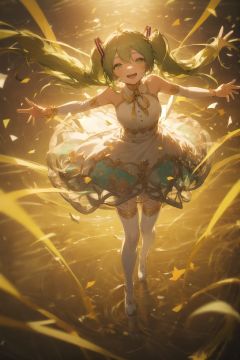 kahuka1, 1girl, strapless dress, hatsune miku, strapless, dress, solo, long hair, twintails, very long hair, see-through, white dress, from above, ribbon, see-through dress, open mouth, smile, bare shoulders, green hair, confetti, looking at viewer, jewelry, blurry, yellow ribbon, thighhighs, full body, green eyes, outstretched arms, white footwear, depth of field, gold trim, bangs, standing, neck ribbon, teeth, bracelet, looking up <lora:kahuka-pynoise:1>
