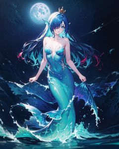liquid clothes, 1girl, solo, moon, ((mermaid)), blue eyes, dress, blue hair, long hair, water, blue dress, full moon, bare shoulders, liquid hair, looking at viewer, blue theme, night, sky, collarbone, crown, full body, very long hair, monster girl, breasts, night sky, personification, strapless, strapless dress, mermaid, hair over one eye, waves, multicolored hair, standing, <lora:LiquidClothesV1:1>