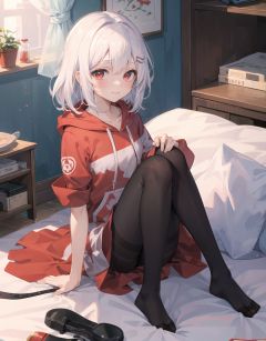 ((masterpiece)), ((best quality)), (ultra-detailed), (illustration), ((an extremely delicate and beautiful)),extremely detailed CG unity 8k wallpaper,close-up,(1girl),(solo),young girl,((loli)),(medium hair),(white_hair),(red_eyes),(black pantyhose:1.3),(oxblood red hoodie:1.3),(bottomless),facing viewer,seductive smile ,(huddle), ((clasp knees)),(sitting on bed),Bed,Gorgeous bed