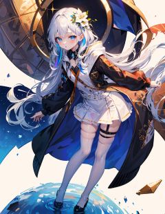 [(white background:1.4)::5], (imid shot:0.95), (full body:1.25), Dynamic angle, [Bottle bottom],(official art),extremely delicate and beautiful,2d,(fantasy),depth of field,solo, a beautiful detailed girl, solo,full body,(masterpiece), ((best quality)), (ultra-detailed), (an extremely delicate and beautiful),extremely detailed CG unity 8k wallpaper,detailed background,(by exquisite colors block),depthoffield,(Medium shot),(1girl:1.4),(solo:1.2),young girl,(small breasts,platinum_hair,parted bangs,long hair),beautiful detailed eyes,(eyeshadow),(rainbow gradient eye:1.2),hair clip,(thigh strap),(hair flower),(collar),(white thighhighs:1.3),(skirt),(black hoodie:1.25),(thigh strap),(hair flower),(collar),Standing,(rainbow crystal:1.2),blue sky with clouds,beautiful detailed sky,ray tracing,reflection light,