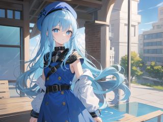 outline,highres,illustration,Tables and chairs in disarray,The residual eaves DuanBi,beautiful sky,1girl/(cute anime face,(beautiful detailed Loli),expressionless,cold attitude,blue pupils, long hair, blue hair,(beautiful detailed eyes),trench_coat,blue beret,small_breasts,,Collar, shoulder buckle, lining,,/)