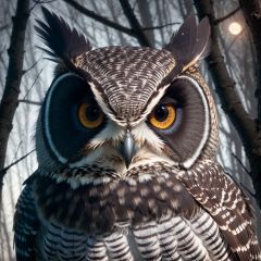 Capture the enigmatic nature of a nocturnal owl, focusing on its large, detailed eyes, distinctive facial features, and intricate feather patterns. Utilize a moonlit setting for added mystique.
