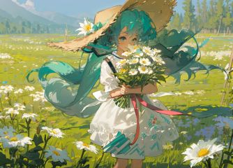 kahuka1, 1girl, flower, dress, solo, hat, white dress, long hair, bouquet, white flower, holding, outdoors, field, white headwear, flower field, holding bouquet, skirt hold, standing, sun hat, ribbon, holding flower, hatsune miku, bow, aqua hair,light,sunlight <lora:dream:1>