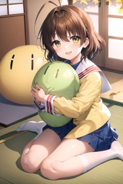 furukawa_nagisa_clannad, sitting, wariza, upper body, from side, smile, yellow jacket, autumn_school_uniform, blue skirt, green doll, doll_dango, doll hug, white socks, no shoes, indoors, tatami, sliding doors