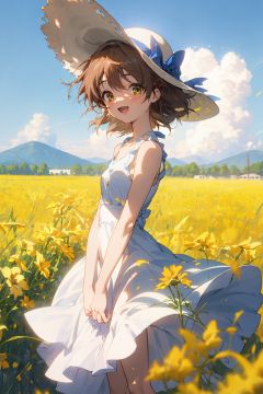 <lora:furukawa-nagisa_CLANNAD_v1:1>, furukawa_nagisa_clannad, cowboy shot, from side, depth of field, looking at viewer, sun hat, white hat, hat bow, :d, smile, sundress, sleeveless dress, white dress, v arms, outdoors, day, wind, cloud, blue sky, mountainous horizon, flower field, rapeseed blossoms