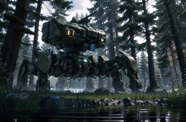 <lora:quadruped mechasV2:1>, 8k wallpaper, masterpiece,Cinematic Lighting, best quality,Illustration,detailed face depiction,dramatic angle,mecha \\\(flegs\\\), tree, nature, scenery, forest, outdoors, robot, grass, moss, water, ruins, mecha