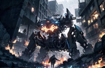 <lora:quadruped mechasV2:1>, 8k wallpaper, masterpiece,Cinematic Lighting, best quality,Illustration,detailed face depiction,dramatic angle,mecha \\\(flegs\\\), mecha,robot, fire, science fiction, rain, weapon, glowing,city,ruins,wars