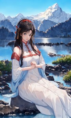 shukezouma,(illustration:1.1),(bestquality),(masterpiece:1.1),(panoramashot:1.3),(fullbody:1.25),(solo:1.2),highres, (inksplashing),(colorsplashing),(watercolor),mountainoushorizon, 1girlsitting,garden,bridge,river,reflection,bonian,ru_qun,hanfu,hanfugirl,whiteshirt,whiteskirt, lookingbehind,makehappyexpressions,softsmile,pure,beautyfulldetailedfaceandeyes,normalbreasts blackhair,blackeyes,