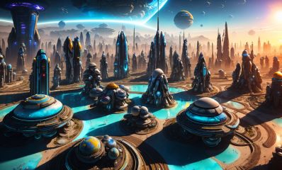 UHD, anatomically correct, textured skin, ccurate, super detail, high details, award winning, best quality, high quality,future world,city in an oasis, Science and technology sense architecture, A giant robot, blue  planets in the sky, Tiny human beings., The sun is on the horizon, Colorful light,<lora:Tesseract_2.0:1>