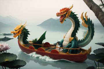 longzhou <lora:longzhou:0.6>water,Boat,Dragon,Chinese Dragon,lotus leaf,