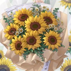 bouquet,yellow rose,pyrethrum parthenium,sunflower,eucalyptus,yellow packing ,eucalyptus, <lora:TS_Bouquet_V14:1>
