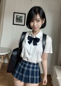 standing pose,best quality, masterpiece, illustration, an extremely delicate and beautiful, extremely detailed ,CG ,unity ,8k wallpaper, Amazing, finely detail, masterpiece,best quality,official art, extremely detailed CG unity 8k wallpaper,absurdres, incredibly absurdres, huge filesize,ultra-detailed, highres, extremely detailed, xiaolin, wzjbxzh, JK Style, a girl, skair, pleated skirt, plaid, school bag, beautiful detailed girl, black eyes, solo, (((smile))), looking at viewer, long hair, School uniform, background blurry, (large aperture: 1.2), black hair, necklace, earrings,((detailed face,perfect face)), (extremely detailed eyes),((looking at viewer)),(real person,photograph),cute,1girl,19 yo,(bob cut hair),makeup,(light blue shinny contact lens), (light pink eye shadow),(haunting smile),(moist lips),narrow waist,(slim),(white_skin),blush, shy,outdoor,  bright light, overexposed, simple clean blurred background,  waist up, bust up,upper body:1.3, half body:1.4, indoor,bed,chairs,fullbody_photoshoot:0.7, solo girl turns her head to the side, staring at camera,masterpiece, best quality, ultra highres, 8k, RAW photo, (soft focus:1.4),photo realistic,realcumAI ,film grain, (lens distortion:0.7), (chromatic aberration:0.7), intricate,cinematic lighting,cinematic,depth of field, perfect, hyper-detailed, ultra realistic, intricate details, tonemapping,hyper detailed, a character portrait by senior character artist, trending on Artstation,(detailed face:1.2), (kawaii:1.2), beautiful face, smart,Shorts, fashionable,pureerosface_v1:0.01