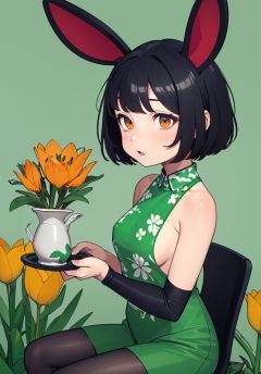1girl, bamboo, ivy, leaf, palm_tree, plant, potted_plant, tanabata, tanzaku, vines, flower_pot, palm_leaf, branch, solo, vegetable, carrot, cactus, morning_glory, lily_\(flower\), rabbit_ears, breasts, short_hair, vase, holding_vegetable, black_hair, watering_can, lily_pad, tulip, small_breasts, four-leaf_clover, animal_ears, grass, lily_of_the_valley, bare_shoulders, seaweed, sitting, playboy_bunny, pantyhose, fake_animal_ears, spring_onion, looking_at_viewer, bangs, white_background, <lora:cute-animev1:0.8>