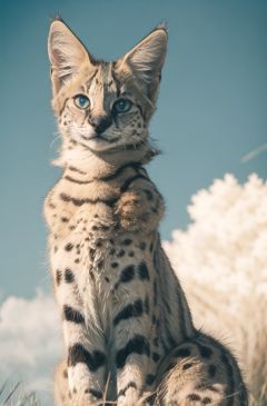 (masterpiece, best quality:1.3),highres,perfect lighting,4k,summer,big eyes,outdoors,africa,day light,blue sky,solosharp focus,soumao,servalcat<lora:servalcat:0.7>