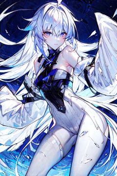 masterpiece, best quality, 1girl,watercolor \(medium\),  <lora:WaterSkin:0.6>,torn bodystocking, white hair,bang,long sleeves,  <lora:21:0.8>