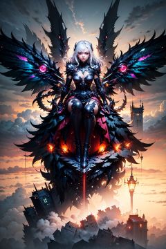 <lora:chibangnv:0.7>chibangnv,1girl,wings,White background,Long hair,, red,black,pink castle in the sky,above the clouds,magnificent,palace,machine castle,mechanical,engine style,steampunk,futuristic,cyberpunk
