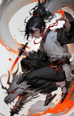 letterboxed, male_focus, black_hair, weapon, solo, red_eyes, sandals, 1boy, japanese_clothes, sword, illustration.media,  ,action shot, <lora:NijiExpressV2:0.9>, masterpiece, best quality,