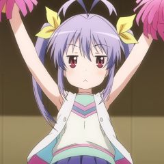1girl, solo, pom pom (cheerleading), twintails, cheerleader, triangle mouth, antenna hair, skirt, purple hair, ribbon, long hair, hair ribbon, red eyes, :<, armpits, looking at viewer, jitome, arm up, chestnut mouth