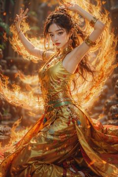 Best quality,masterpiece,ultra high res,1girl,beautiful_face,detailed skin,yuhuoshu,jewelry,solo,earrings,(fire:1.3),blurry,realistic,lips,bent over,chinese zen,<lora:御火-000006:0.8>,(Giant Flame Circle:1.2),(Full of flame energy:1.2),