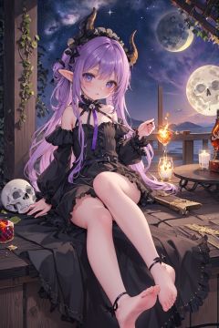 //,masterpiece, ((best quality)), (ultra-detailed), (illustration), an extremely delicate and beautiful, dynamic angle, chromatic aberration,((Medium shot)), ((colorful)),//,little girl,1girl,loli,petite,black dress,lolita,Bare foot,blue eyes,dark purple hair,long hair,Dead skin,Shiny skin,small breast,ringlet twin tail,(Skull headwear,Demon tail,Demon horn,elf,hair ribbon),despair,The crows were feeding on the rotting carcass,table,hell,Beelzebub,dark,night,(moon:1.02),star,meteor,milky way,