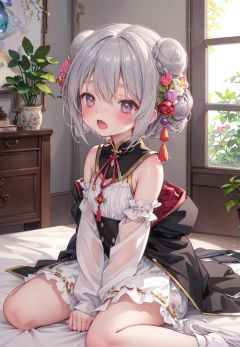 //masterpiece, ((best quality)), (ultra-detailed), (illustration), an extremely delicate and beautiful, dynamic angle, chromatic aberration,((Medium shot)), ((colorful)),//,(loli:1.2),petite child,double bun,chinese clothes,bloomers,black coat,night,indoors, grey hair, (purple hair:0.5), //,sitting,wariza,(half-closed eyes:1.1), shy,blush,tears in eyes,open mouth,(yawning:1.1),fang,arms between legs, hand between legs,= =, grey eyes,