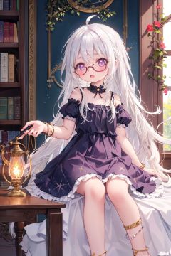 //,masterpiece, ((best quality)), (ultra-detailed), (illustration), an extremely delicate and beautiful, dynamic angle, chromatic aberration,((Medium shot)), ((colorful)),//,1girl,little girl,1girl,loli,petite,loli,looking away,Black rimmed glasses,dress,Constellation print,anklet,barefoot,sitting,(white hair:1.3),(long hair:1.3),ahoge,purple eyes,open mouth,(Dim light),classical,library, plant, Oil lamp,