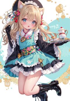 masterpiece, ((best quality)), (ultra-detailed), (illustration), dynamic angle, chromatic aberration, ((colorful)),//,1girl,loli,(petite child:1.05),//,1girl, gloves, bunny, cup, boots, teapot, white gloves, teacup, apron, wide sleeves, solo, new year, watch, japanese clothes, holding, tray, cookie, food, long hair, kimono, looking at viewer, frills, pocket watch, holding tray, happy new year, long sleeves, blue kimono, bangs, animal, black footwear, white apron, full body, fur trim, bonnet, blonde hair, sparkle, frilled apron, saucer, blue eyes, sash, animal ears, brown footwear, arm up, waist apron, fur-trimmed gloves, blush, heart, parted lips, signature, eyebrows visible through hair, 2021, plate, checkerboard cookie, white background, dated, obi, high heel boots, hair ornament, 2020, hat, open mouth, :o, holding plate, blue dress, aqua kimono, high heels, wa maid, green kimono, bow, rabbit ears, fake animal ears, tea, hand up, dress, frilled sleeves, chinese zodiac, aqua eyes, light brown hair, blue headwear, checkered, belt, striped, tilted headwear, maid apron, hairband, macaron, ribbon, cupcake,