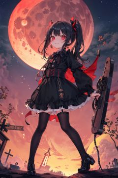 //,1girl,loli,(petite child:1.05),//,clockbackground,outdoors,Graveyards,(bloody moons:1.3), red moonlight, straight,weird scenes, scary styles, scares,full body,long black hair,blood red eyes, mad eyes, wild laughter,lolita,Gothic style,straight-on, blood on face, crazy, dark_persona, smirk,