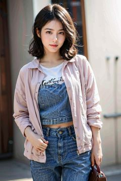 Bokeh,standing, ultra detailed, official art, 4k 8k wallpaper, (Soft light and shadow), hand detail, eye high detail, 8K,(best quality:1.5),pastel color,soft focus,masterpiece,studio,hair high detail,((pure background :1.2)),1girl,(large breasts:1.1),(Perfect female body:1.1),Spring shopping outfit, comfortable denim jacket, simple white t-shirt, loose-fitting cropped pants, dark denim jeans, white sneakers, natural straight hair, small curls, natural brown hair color, black hair color, natural base makeup, light pink blush and lip gloss., <lora:ShinYeEun:0.8:lian>,ShinYeEun,(low ponytail,Asymmetrical bangs,Dip-dye hair:1.2)