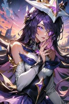 (Masterpiece:1.2), best quality, (illustration:1.2), <lora:Star_Guardian_Syndra-000018:1>, star guardian syndra, 1girl, purple hair, hair ornament, frilled skirt, dress, upper body, potrait, city, park, starry sky