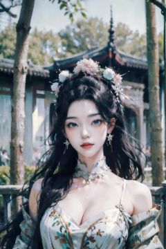 Best quality,masterpiece,ultra high res,(photorealistic:1.4),Detailed face,((1girl)),solo,cleavage,full body,Beautiful girl,upper body,sheath,architecture,<lora:suzhouyuanlin:0.8>,bush,day,dress,forest,fountain,garden,grass,long_hair,moss,nature,outdoors,overgrown,path,plant,road,scenery,stairs,star_\(sky\),tree,very_long_hair,<lora:sd-No.183-000014:0.8>,