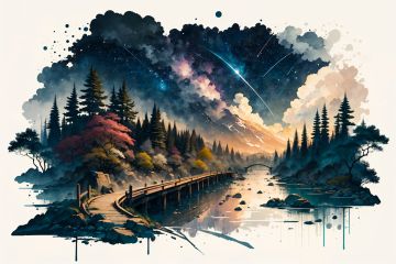 white background, ((masterpiece)), best quality, (8k, best quality, masterpiece:1.2), super detail, a bridge across the river, landscape, no humans, sadness,oil painting \(medium\) fake sky,(multiple fake stars falling from sky:1.2),floating star shape falling down,broken ground ,<lora:Ink scenery:1.0>