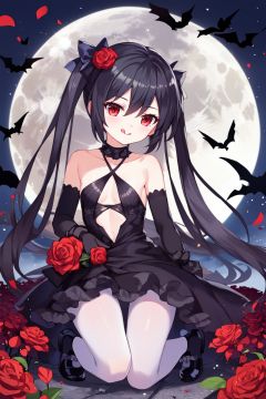 1girl, red flower, solo, tongue out, criss-cross halter, red rose, gloves, black dress, dress, flower, red eyes, bangs, long hair, rose, tongue, pantyhose, white pantyhose, black gloves, halterneck, petals, hair between eyes, very long hair, :q, moon, black footwear, elbow gloves, hair ornament, hair flower, bow, full moon, bat \(animal\), twintails, white hair, bare shoulders, red bow, closed mouth, hair bow, grave, cross, looking at viewer, small breasts <lora:tsubasahdLycoris:0.7>