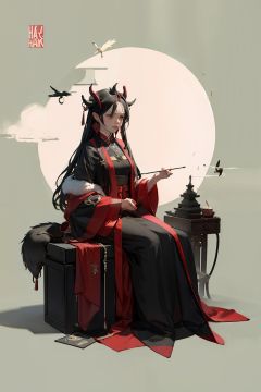 masterpiece, best quality, <lora:hanfu:1>,hanfukozue, 1girl, solo, long hair, horns, black hair, umbrella, dusk (arknights), pointy ears, tail, dragon horns, holding, dragon girl, red eyes, multicolored hair, sitting, oil-paper umbrella, dragon tail, jewelry, tassel, earrings, holding umbrella, dress, very long hair, green hair, looking at viewer, streaked hair, tassel earrings, colored skin, full body, alternate costume, long sleeves, closed mouth, green skin, wide sleeves, bangs, snow, bracelet, smile, chinese clothes, gloves, branch, official alternate costume