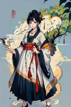 masterpiece, best quality, <lora:hanfu:1>,hanfukozue, 1girl, bird, black hair, hanfu, chinese clothes, jewelry, hair ornament, hair bun, solo, necklace, dress, wide sleeves, long sleeves, long hair, single hair bun, sash, bangs, looking at viewer, shawl, earrings, facial mark, forehead mark, black eyes, blunt bangs, beads, white dress, standing, smoke, hand up, holding, branch, full body, hair stick