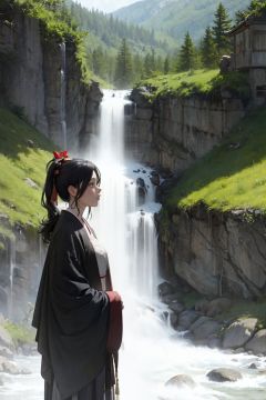 masterpiece, best quality, <lora:hanfu:1>,hanfukozue, solo, 1girl,ink wash,black hair, ponytail, long hair, flower, hair ornament, long sleeves, outdoors, holding, tree, skirt, waterfall, wide sleeves, japanese clothes, water, chinese clothes, branch, from side, upper body, standing, profile, day, kimono, pink flower, scenery, black skirt