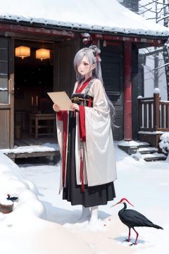 masterpiece, best quality, <lora:hanfu:1>,hanfukozue, 1girl, umbrella, long hair, solo, oil-paper umbrella, holding, branch, holding umbrella, alternate costume, bird, looking at viewer, hanfu, grey hair, standing, long sleeves, bangs, blue eyes, shenhe (genshin impact), closed mouth, crane (animal), red bow, grey eyes, animal, hair over one eye, chinese clothes, blush, snowing, snow, wide sleeves, tree, bow, snake, very long hair, jewelry, outdoors, shawl, white hair, earrings, hair between eyes, smile, bare tree