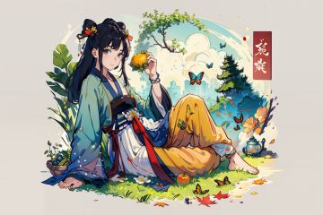 masterpiece, best quality, <lora:hanfu:1>,hanfukozue, 1girl, black hair, bug, butterfly, barefoot, solo, hair ornament, sitting, hanfu, chinese clothes, anklet, leaf, fruit, jewelry, white background, long sleeves, simple background, food, grapes, full body, single hair bun, holding, hair stick, wide sleeves, hair bun, smile, yokozuwari, looking at viewer, long hair, closed mouth, hand up, flower, holding leaf, on floor