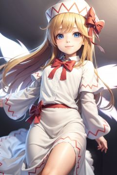 masterpiece, best quality,   <lora:llw:1>,lily white, 1girl,hat,blonde hair,long hair,blue eyes,smile,bow,wide sleeves,white dress,wings,(grey background:1.2),(kbxll:0.6)