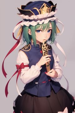 masterpiece, best quality, <lora:shikieiki:1>,1girl,shiki eiki, hat, blue vest,white shirt,black shirt, green hair, rod of remorse,short hair,long sleeves, bow, blue eyes, , ribbon, red bow, closed mouth, ribbon-trimmed skirt, (grey background:1.2), simple background,