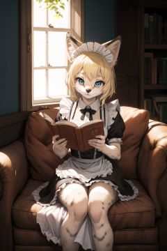 masterpiece, best quality,1girl,furry,reading book,blonde,servalcat,side of windows,perfect light,sit,kitten,adorable,maid dresss, looking at viewer, <hypernet:furry_kemono:0.3> <lora:servalcat:0.7>