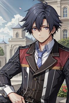 rean,1boy,black hair,rean,violet eyes,ahoge,big and detailed eyes, face, ((solo)),((no facial expression)) male_focus, portrait, ((solo)), (masterpiece),striped necktie,pants,closed_mouth,collared_shirt,long_sleeves,looking_at_another,male_focus,shirt,(((solo))),outdoors,plants,buildings,blue sky,petals,god rays
