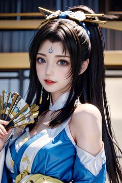 huowu,1girl, solo, black hair, long hair,white thighhighs, chair, high heels, cosplay,((upper body)),young and beautiful, tall and beautiful, fair face, perfect features, tall and beautiful, fair skin, good figure, 4k,cg,holding fan, blue theme,gameCG background,3Drender,realistic,cinematic lighting,smooth fog,detailed face, <lora:chilloutmixss_xss10:0.1> <lora:japaneseDollLikeness_v10:0.3>light smile, (((The Architectural Background of Japanese Style)))