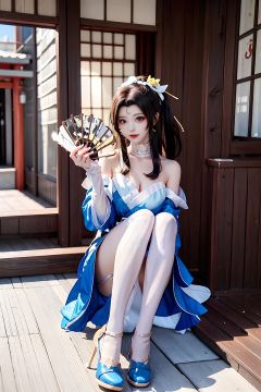 huowu,1girl, solo, black hair, long hair,white thighhighs, chair, high heels, cosplay,((upper body)),young and beautiful, tall and beautiful, fair face, perfect features, tall and beautiful, fair skin, good figure, 4k,cg,(((full body))), sitting sideways, holding fan, blue theme,gameCG background,3Drender,realistic,cinematic lighting,smooth fog,detailed face, <lora:chilloutmixss_xss10:0.1> <lora:japaneseDollLikeness_v10:0.3>light smile, (((The Architectural Background of Japanese Style)))