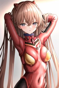 masterpiece, best quality,  asuka, 1girl, plugsuit, solo, looking at viewer, red bodysuit, upper body, arms up, hair between eyes, arms behind head, parted lips, very long hair <lora:asuka:1>