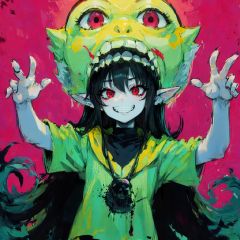by aaron horkey,1girl, solo,monster girl,fangs, grin,red eyes,horror