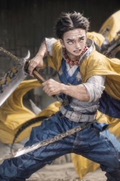 himejima_gyoumei, solo, long_sleeves, 1man, weapon, male_focus, cowboy_shot, teeth, sword, holding_weapon, chain, black_pants, clenched_teeth, veins, fighting_stance, scar_on_nose