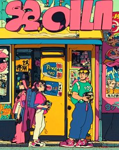 hayao miyazaki \(style\),(90s fashion:1.5),(retro photography),(girl:1.2),(Japan:1.4),(nostalgic vibes:1.3),(urban street:1.3),(full-body shot:1.444),(street photography),(vintage look),(solo),(dynamic pose),(90s hairstyle:1.2),(bold and colorful outfit),(denim jacket with patches),(baggy jeans),(sneakers with vibrant colors),(retro accessories:1.15),(choker necklace),(oversized sunglasses),(scrunchie in hair),(graphic t-shirt:1.1),(pop culture reference),(walkman in hand),(90s graffiti backdrop),(authentic street art),(neon signs and billboards:1.2),(old school arcades),(vintage cars),(cassette tapes),(authentic 90s atmosphere),(nostalgic color grading:1.2),(film grain effect),(capturing the essence of the era)